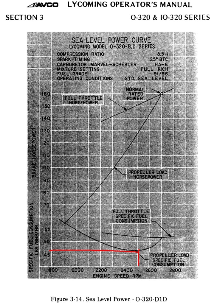 Below is a graph from the Lycoming owner’s manual which maps the O-320’s BSFC at the bottom. Following the red line up and over, you will find a BSFC value of .46 pounds of fuel per horsepower per hour. This equates to about .077 gallons to produce one horsepower for an hour.