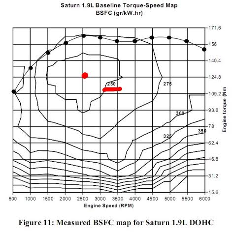 The small red dot on the graph represents the point where this engine is most thermally efficient. The value underlined in red represents the fuel flow in Grams required to produce one Kilowatt per hour at this point. Converted to American units, this engine requires about .068 gallons to produce one horsepower for one hour. This equates to about 2 gallons to produce the approximate 30 HP required to propel the Saturn for an hour down the highway at highway speeds. Pretty impressive huh?